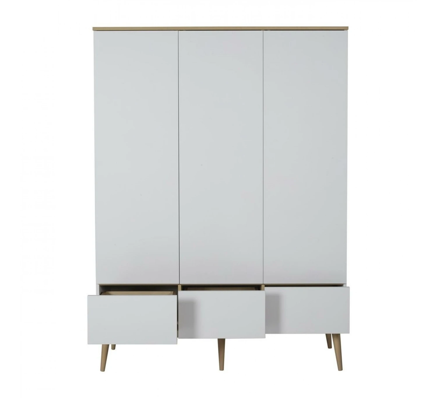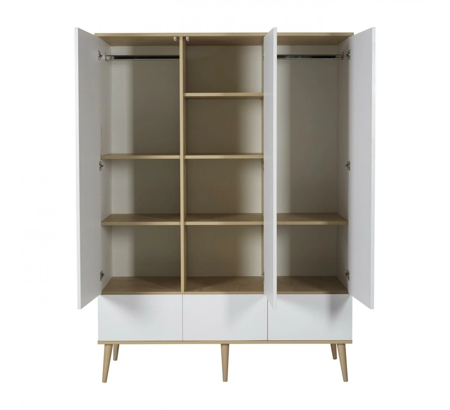De 3-deurskast Flow van het merk Quax is ideaal voor in de babykamer. Deze ruime designkast biedt veel opbergruimte. Naast de vele ruimte achter de drie deuren beschikt de kast ook nog over drie lades om kleding of spullen in op de kunnen bergen. De kast wordt geleverd met met zes legplanken en twee kledingroedes. De kast is uitgevoerd met de kenmerkende ranke pootjes die de kast een mooie uitstraling geven. De kast is gemaakt van MFC en beukenhout. De kast is in verschillende kleuren verkrijgbaar. Combineer de kast met de andere meubelen uit de Flow collectie.