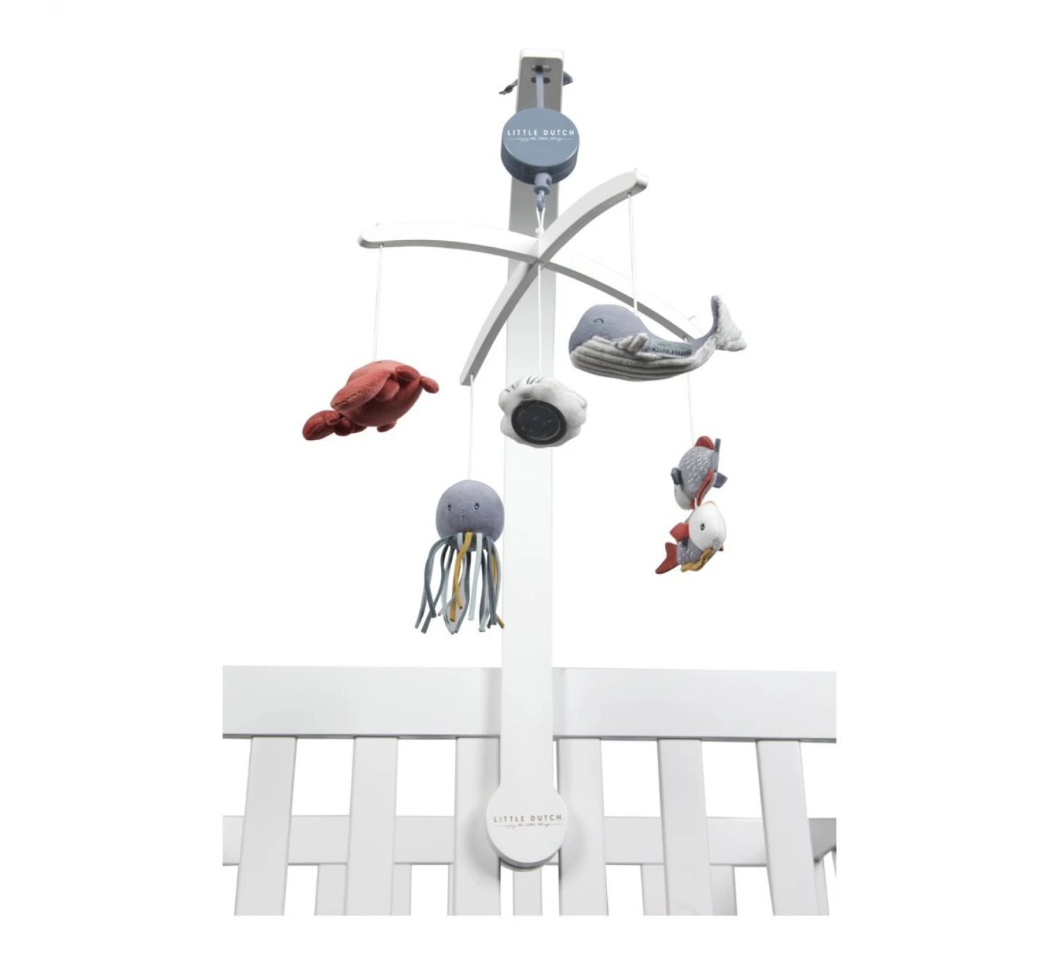 Deze mooie houten Little Dutch muziekmobiel werkt rustgevend voor baby’s dankzij een lief slaapliedje. Aan de mobiel hangen vijf speeltjes met waterdieren in het Ocean-thema. Baby’s kijken graag naar de beweging van deze speeltjes, wat hun visuele ontwikkeling stimuleert.